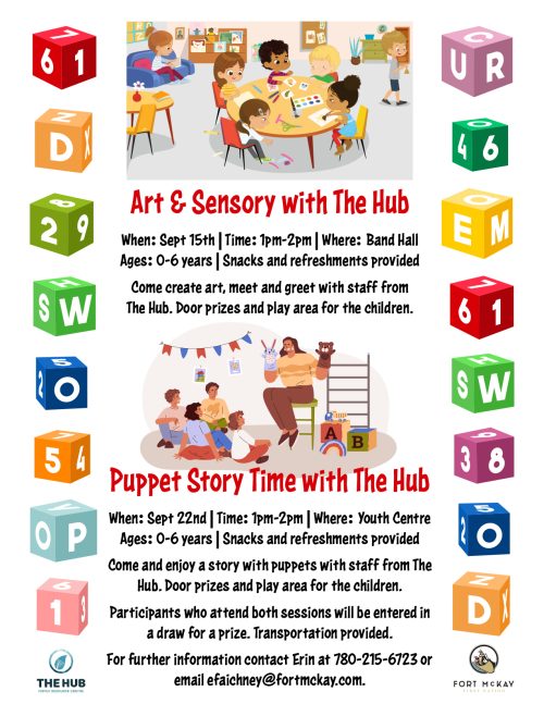 Come create art, meet and greet with staff from The Hub. Door prizes and play area for the children. For further information contact Erin at 780-215-6723 or email efaichney@fortmckay.com.