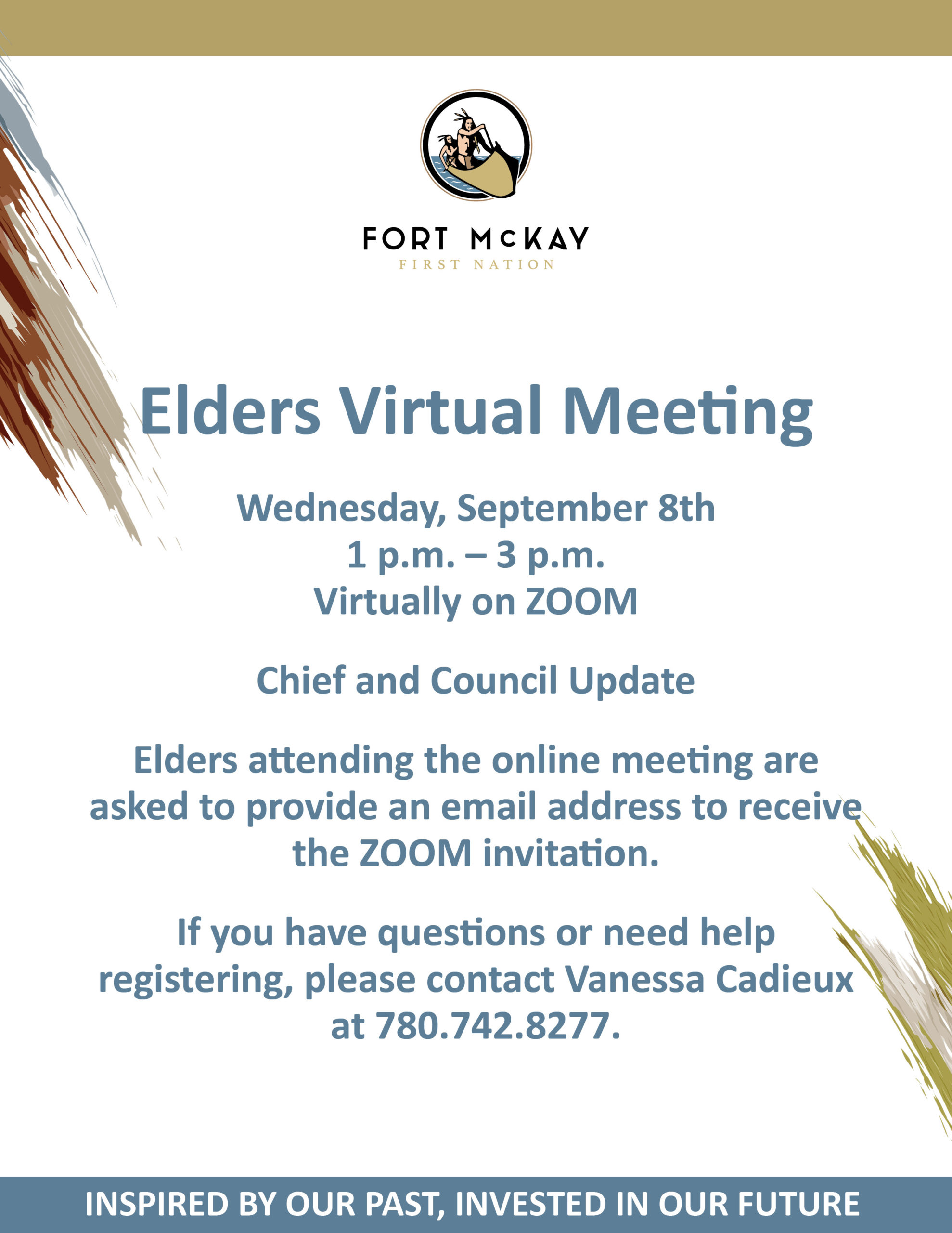 IMPORTANT UPDATE To help keep everyone safe, the Elders Meeting scheduled for September 8th will be VIRTUAL ONLY. If you have questions or need help registering, please call Vanessa at 780.742.8277