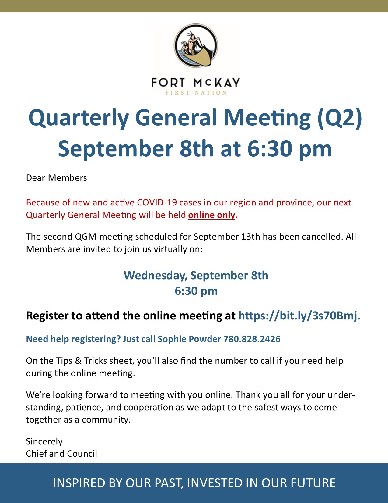 IMPORTANT UPDATE To help keep everyone safe, the QGM scheduled for September 8th will be VIRTUAL ONLY. The QGM scheduled for September 13th is cancelled. All Fort McKay First Nation members are invited to virtually attend the QGM on September 8th. Please register at https://bit.ly/3s70Bmj. Need help? Just call Sophie Powder at 780.828.2426.