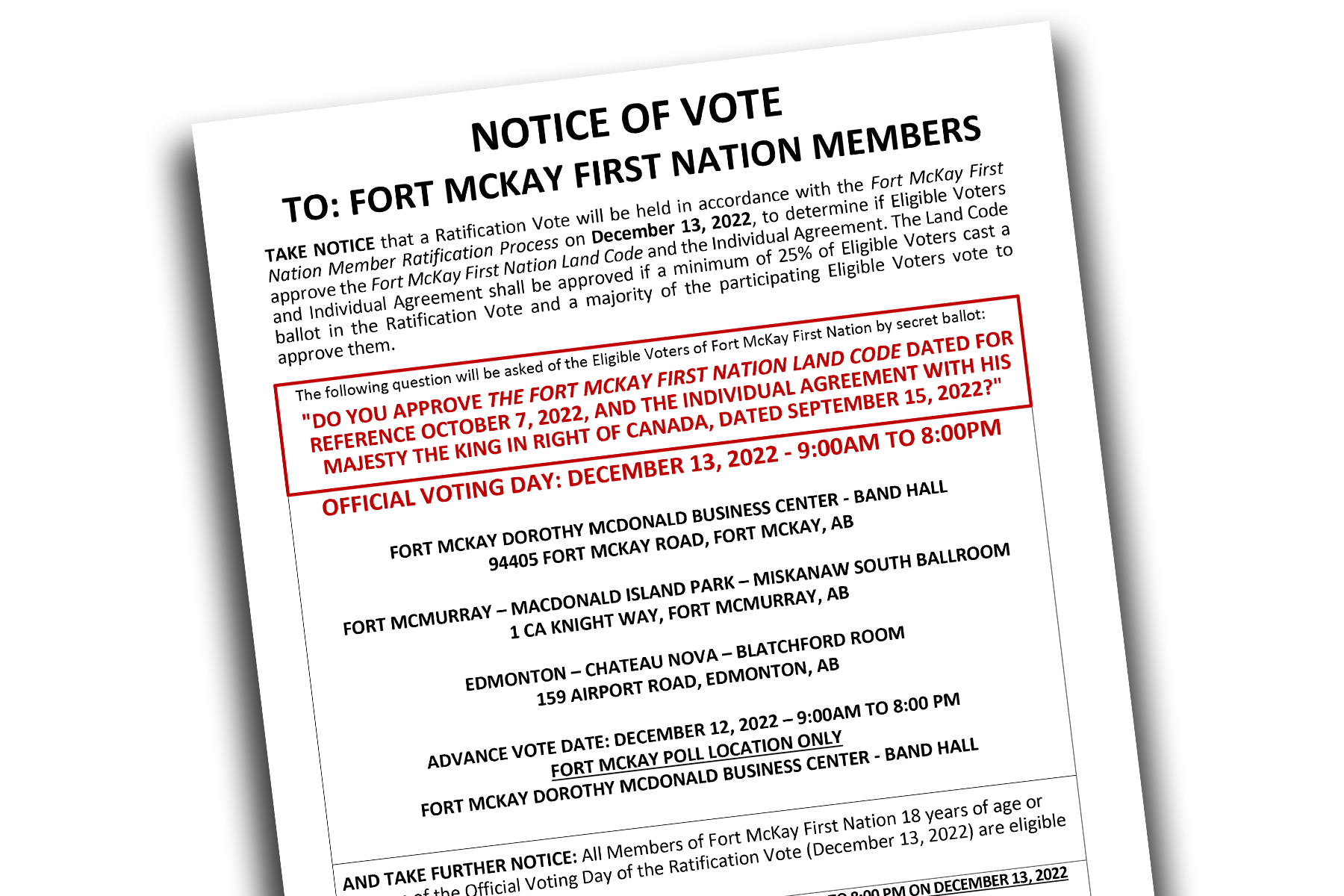 Advance in-person voting day on December 12, 2022, from 9:00 am to 8:00 pm in Fort McKay ONLY.